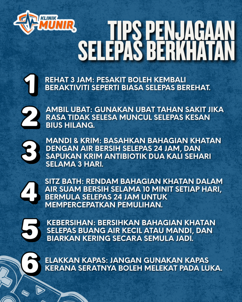 Ikut arahan doktor: ganti balutan ikut jadual, ambil ubat tahan sakit, elak aktiviti lasak, dan pantau tanda jangkitan. Jika ada bengkak melarat, demam, atau bau tidak normal, hubungi kami segera.